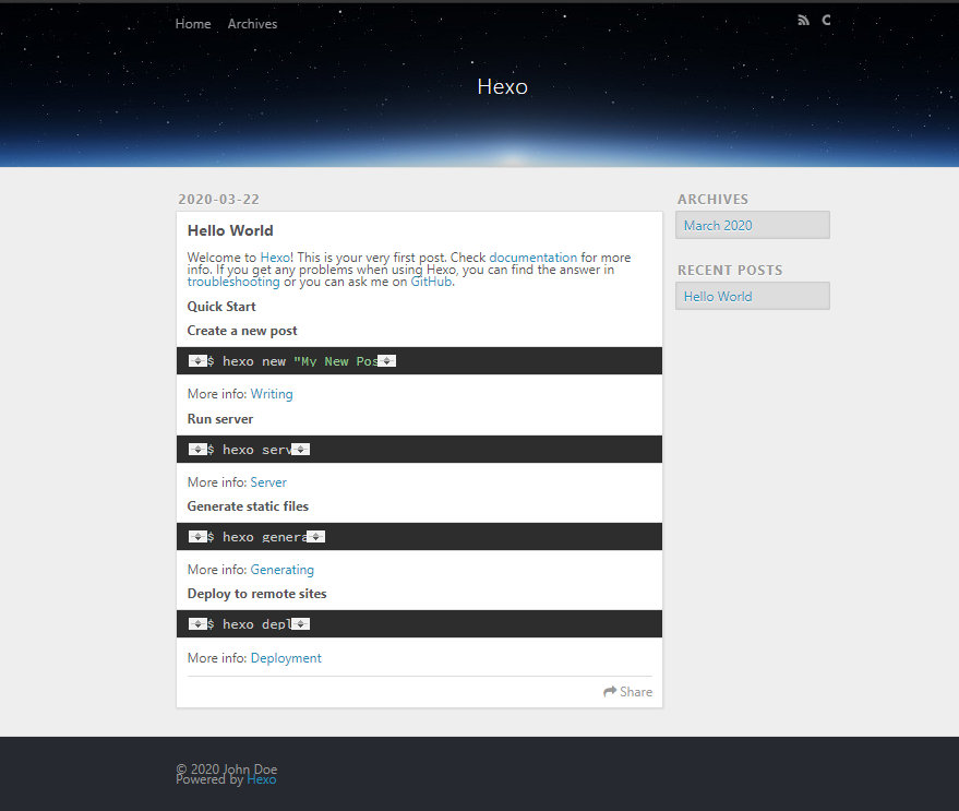 hexo s == hexo server 生成本地静态网站,本地预览:localhost:4000,开启预览访问端口(默认端口4000,'ctrl + c'关闭server)