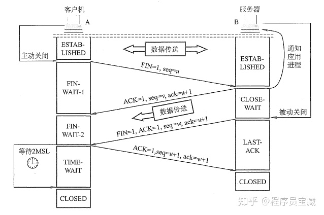 - 第二次握手:服务器收到连接释放报文段后即发出确认,确认号是ack = u + 1, 而这个报文段自己的序号是v, 等千它前面已传送过的数据的最后一个字节的序号加1 。此时,从客户机到服务器这个方向的连接就释放了,TCP连接处千半关闭状态。但服务器若发送数据,客户机仍要接收,即从服务器到客户机这个方向的连接并未关闭。