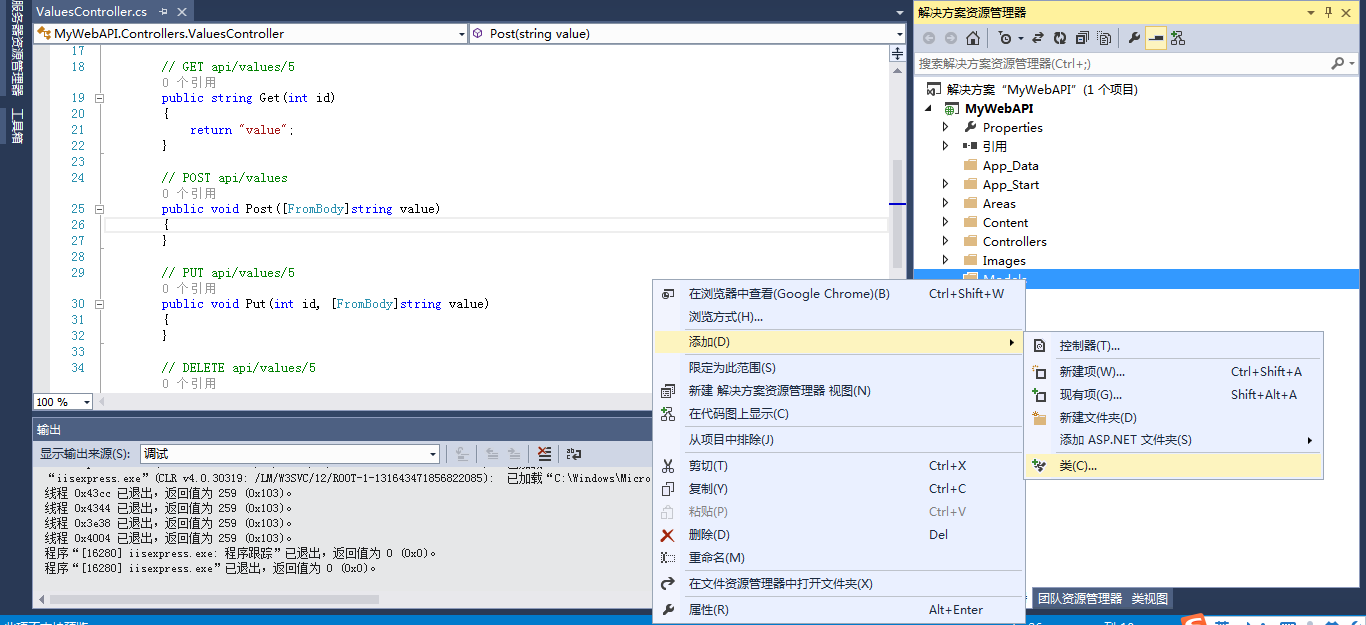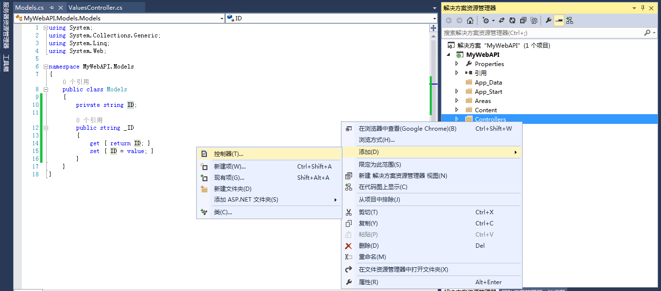 工程解决方案选择Controllers文件夹右键添加一个新的Web API controller
