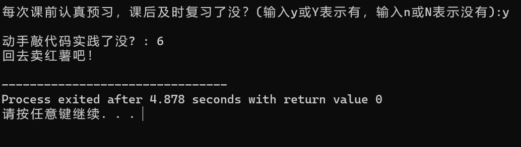 printf("每次课前认真预习,课后及时复习了没?(输入y或Y表示有,输入n或N表示没有):");