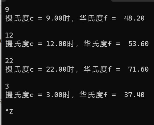 printf("摄氏度c = %.2f时,华氏度f = %.2f\n", c, f);