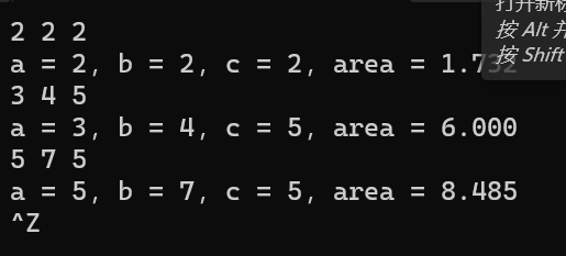 printf("a = %d,b = %d,c = %d,area = %.3lf",a,b,c,area);