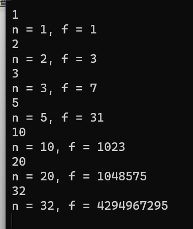 #include <stdio.h> long long func(int n) { long long ans; if(n == 1) { ans = 1; } else { ans = (func(n-1)+1)*2 - 1; } return ans; } int main() { int n; long long f; while (scanf("%d", &n) != EOF) { f = func(n); printf("n = %d, f = %lld\n", n, f); } return 0;