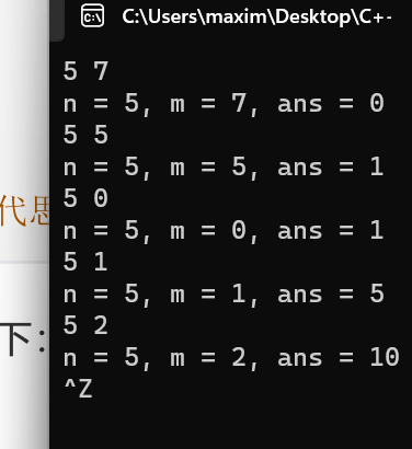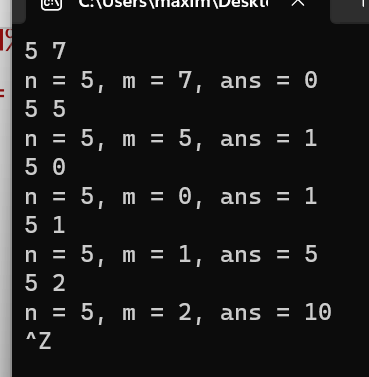 #include <stdio.h> int func(int n, int m) { int ans; if(m > n) { ans = 0; return ans; } else if(m == n) { ans = 1; return ans; } else if(m == 0) { ans = 1; return ans; } else if(m < n) { ans = func(n-1,m) + func(n-1,m-1); } } int main() { int n, m; while(scanf("%d%d", &n, &m) != EOF) printf("n = %d, m = %d, ans = %d\n", n, m, func(n, m)); return 0;