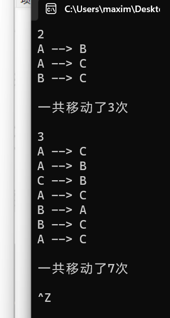 #include <stdio.h> #include <math.h> void move(char a,char b) { printf("%c --> %c\n",a,b); } void hanoi(int n,char A,char B,char C) { if(n == 1) { move(A,C); } else { hanoi(n-1,A,C,B); // A n-1至C 用B move(A,C); // A剩1至C hanoi(n-1,B,A,C); // B n-1值A 用C } } int main() { int N; while(scanf("%d",&N) != EOF) { int tol; tol = pow(2,N) - 1; hanoi(N,'A','B','C'); printf("\n"); printf("一共移动了%d次\n",tol); printf("\n"); } return 0;