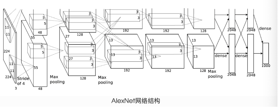 class AlexNet(nn.Module): def __init__(self): super(AlexNet, self).__init__() self.conv = nn.Sequential( nn.Conv2d(1, 96, 11, 4), # in_channels, out_channels, kernel_size, stride, padding nn.ReLU(), # 注意这里的激活函数定义位置和Lenet的区别 nn.MaxPool2d(3, 2), # kernel_size, stride # 减小卷积窗口,使用填充为2来使得输入与输出的高和宽一致,且增大输出通道数 nn.Conv2d(96, 256, 5, 1, 2), nn.ReLU(), nn.MaxPool2d(3, 2), # 连续3个卷积层,且使用更小的卷积窗口。除了最后的卷积层外,进一步增大了输出通道数。 # 前两个卷积层后不使用池化层来减小输入的高和宽 nn.Conv2d(256, 384, 3, 1, 1), nn.ReLU(), nn.Conv2d(384, 384, 3, 1, 1), nn.ReLU(), nn.Conv2d(384, 256, 3, 1, 1), nn.ReLU(), nn.MaxPool2d(3, 2) ) # 这里全连接层的输出个数比LeNet中的大数倍。使用丢弃层来缓解过拟合 self.fc = nn.Sequential( nn.Linear(256*5*5, 4096), nn.ReLU(), nn.Dropout(0.5), nn.Linear(4096, 4096), nn.ReLU(), nn.Dropout(0.5), # 输出层。由于这里使用Fashion-MNIST,所以用类别数为10,而非论文中的1000 nn.Linear(4096, 10), ) def forward(self, img): feature = self.conv(img) output = self.fc(feature.view(img.shape[0], -1)) return output net = AlexNet() print(net)