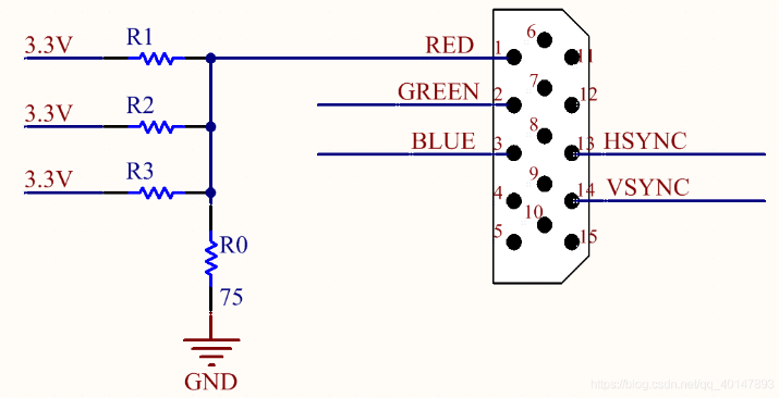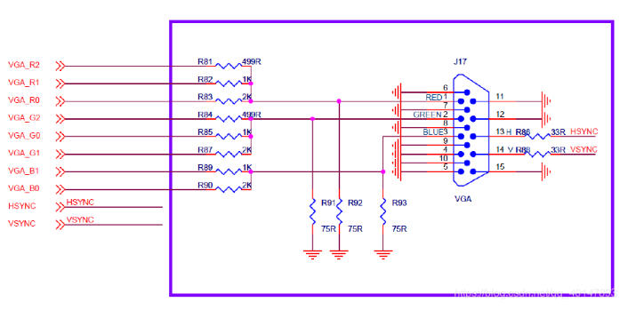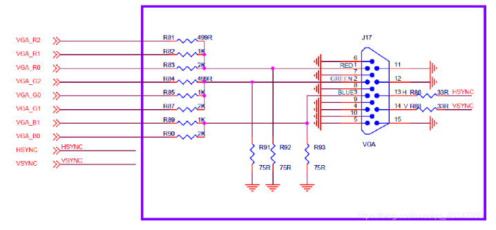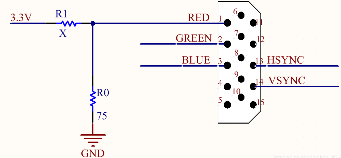 例如VGA显示器要显示纯红色,则在RED引脚要输入0.714V电压,如果我们VGA_RED信号为1位电路如下图所示,那么(X+75)/3.3=75/0.714,计算得出X=271.6。