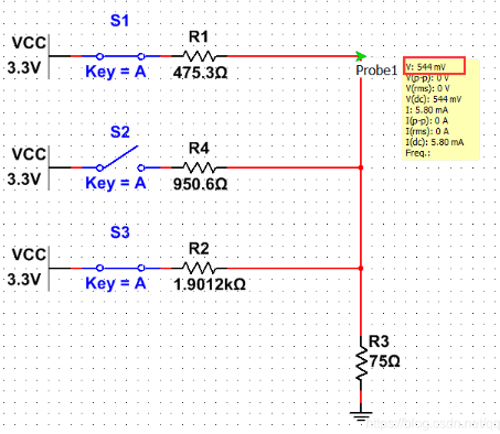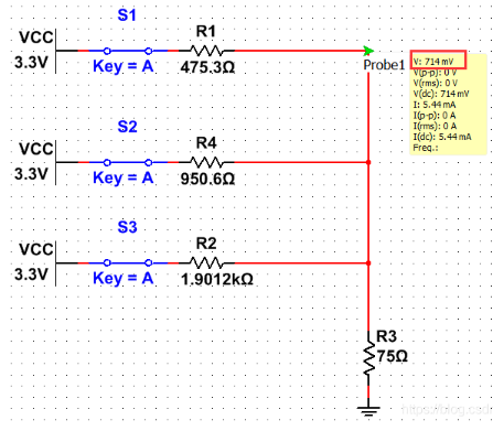 将R1、R2、R3阻值选择为475.3Ω、950.6Ω、1.9012KΩ,并且将R1、R2、R3都接通至3.3V,得出VGA_RED节点电压为0.714V。