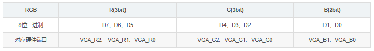 对应硬件端口 VGA_R2、 VGA_R1、VGA_R0 VGA_G2、VGA_G1、VGA_G0 VGA_B1、VGA_B0