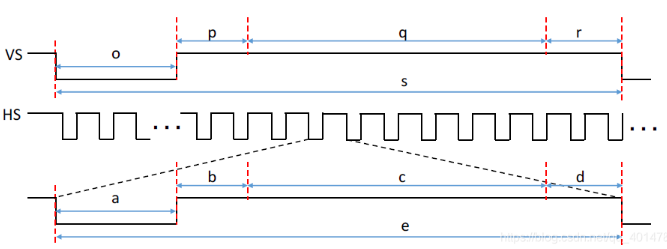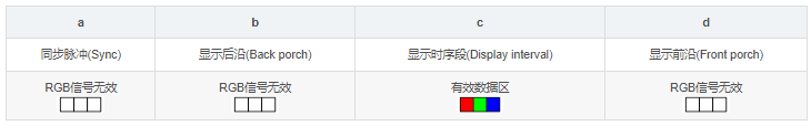 行时序的四个部分分别是:同步脉冲(Sync a)、显示后沿(Back porch b)、显示时序(Display interval c)和显示前沿(Front porchd)。其中同步脉冲(Sync a)、显示后沿(Back porch b)和显示前沿(Front porch d)是消隐区,RGB信号无效,屏幕不显示数据。显示时序段(Display interval c)是有效数据区。