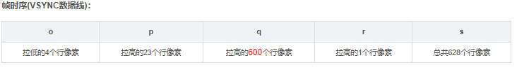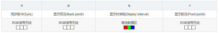 帧时序的四个部分别是:同步脉冲(Sync o)、显示后沿(Back porch p)、显示时序段(Display interval q)和显示前沿(Front porchr)。其中同步脉冲(Sync o)、显示后沿(Back porch p)和显示前沿(Front porch r)是消隐区,RGB信号无效,屏幕不显示数据。显示时序段(Display interval q)是有效数据区。.