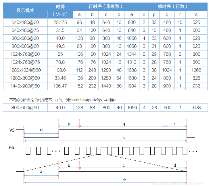 不同的分辨率,它的时序是不一样的。例如800*600@60Hz的VGA时序: