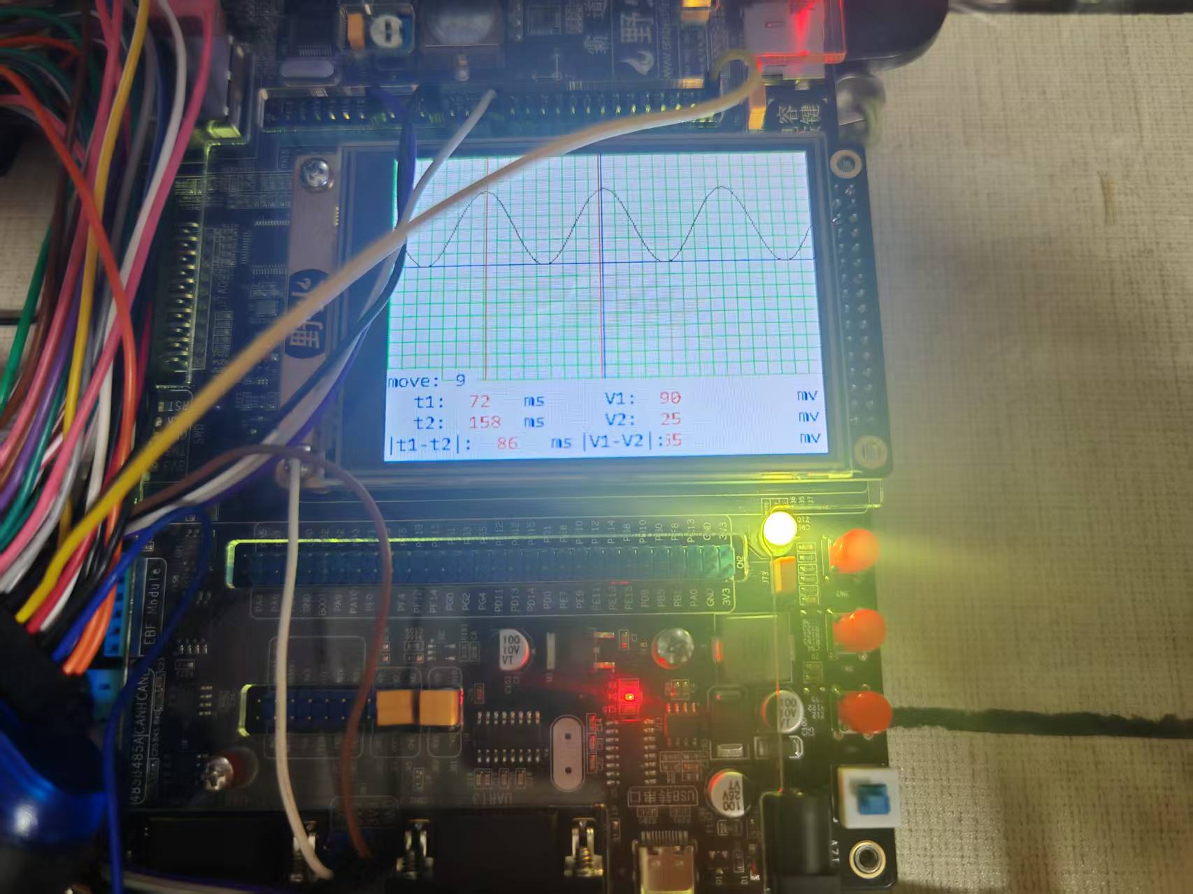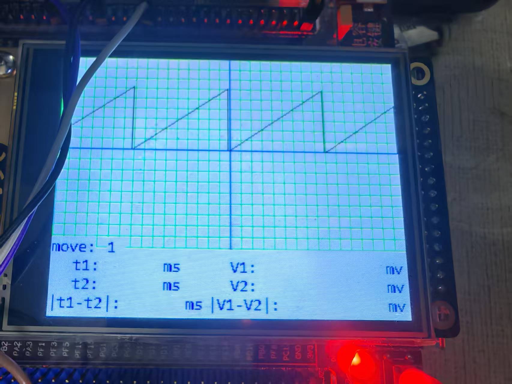 #include "stm32f10x.h" #include "./lcd/bsp_ili9341_lcd.h" #include "./usart/bsp_usart.h" #include <stdio.h> #include "./adc/bsp_adc.h" #include "./timer/bsp_tim.h" #include "./exti/bsp_exti.h" #include "./led/bsp_led.h" #include "./key/bsp_key.h" static void LCD_Test(void); static void Delay ( __IO uint32_t nCount ); void Printf_Charater(void) ; void display (void); unsigned char dat[255] = {"HELLO WORLD!!!\r\n"}; extern unsigned char Res; extern unsigned char rx[255]; uint16_t temp[1000]={0}; uint16_t xemp[1000]={0}; extern uint16_t ms; extern char mode,Z ; extern char node ; extern char k ; char dispBuff[100]; int main() { static uint8_t testCNT = 0; float temp1,temp2; uint16_t adcx,X,Y,X1,Y1; X =X1= 0; LED_GPIO_Config (); LED1(ON) ; KEY_Init (); USART_Config(); USART_Sent(USART1, dat ); printf("OK1\r\n"); USART_Sent(USART1,dat ); adc_init (); printf("OK2\r\n"); Exti_Init(); LED1_ON; ILI9341_Init (); ILI9341_GramScan ( 5 ); LCD_SetBackColor(WHITE); ILI9341_Clear(0,0,320,240); LCD_SetTextColor(BLUE); LCD_SetFont(&Font8x16); ILI9341_Clear(0,0,320,240); display (); TIM_Init(); while(1) { while( mode ==0) { if(Z==1) { Z = 0; adcx = Get_adcAverage (5); temp[ms] = adcx*(3.3/4096)*20; // while(temp[ms]>33) // { // adcx = Get_adcAverage (3); // temp[ms] =adcx*(3.3/4096)*10; // } while(temp[ms]>66) { adcx = Get_adcAverage (3); temp[ms] =adcx*(3.3/4096)*10; } } if(ms == 320) { TIM_Cmd (TIM3,DISABLE); //ILI9341_Clear(0,0,320,240); display (); for(ms=0;ms<320;ms++)xemp[ms]=temp[ms]; LCD_SetTextColor(BLACK); for(ms=0;ms<320;ms++)ILI9341_DrawLine(ms, 90-xemp[ms], ms+1, 90-xemp[ms+1]); ms = 0; TIM_Cmd (TIM3,ENABLE); } } if(mode == 1) { TIM_Cmd (TIM3,DISABLE); while(mode == 1) { if(node ==1) { display (); LCD_SetTextColor(BLACK); for(ms=0;ms<319;ms++)ILI9341_DrawLine(ms, 180-xemp[ms]-90, ms+1, 180-xemp[ms+1]-90); node = 0; LCD_SetTextColor(RED); X=X+k; if(X > 320)X = 0; ILI9341_DrawLine(X, 0, X, 180); /*ʹÓÃc±ê×¼¿â°Ñ±äÁ¿×ª»¯³É×Ö·û´®*/ sprintf(dispBuff,"%d ",X); ILI9341_DispString_EN(60,188,dispBuff); //LCD_ShowNum(110,400,(u32)X,3,24); } if(node ==2) { display (); LCD_SetTextColor(BLACK); for(ms=0;ms<320;ms++)ILI9341_DrawLine(ms, 180-xemp[ms]-90, ms+1, 180-xemp[ms+1]-90); node = 0; LCD_SetTextColor(RED); X=X-k; if(X > 320)X = 320; ILI9341_DrawLine(X, 0, X, 180); //LCD_ShowNum(110,400,(u32)X,3,24); sprintf(dispBuff,"%d ",X); ILI9341_DispString_EN(60,188,dispBuff); } } } while(mode == 2) { if(node ==1) { display (); LCD_SetTextColor(BLACK); for(ms=0;ms<319;ms++)ILI9341_DrawLine(ms, 180-xemp[ms]-90, ms+1, 180-xemp[ms+1]-90); LCD_SetTextColor(RED); ILI9341_DrawLine(X, 0, X, 180); node = 0; X1=X1+k; if(X1 > 320)X1 = 0; ILI9341_DrawLine(X1, 0, X1, 180); //LCD_ShowNum(110,424,(u32)X1,3,24); sprintf(dispBuff,"%d ",X1); ILI9341_DispString_EN(60,204,dispBuff); } if(node ==2) { display (); LCD_SetTextColor(BLACK); for(ms=0;ms<319;ms++)ILI9341_DrawLine(ms, 180-xemp[ms]-90, ms+1, 180-xemp[ms+1]-90); LCD_SetTextColor(RED); ILI9341_DrawLine(X, 0, X, 180); node = 0; X1=X1-k; if(X1 > 320)X1 = 320; ILI9341_DrawLine(X1, 0, X1, 180); //LCD_ShowNum(110,424,(u32)X1,3,24); sprintf(dispBuff,"%d ",X1); ILI9341_DispString_EN(60,204,dispBuff); } if(X1>X) { sprintf(dispBuff,"%d ",X1-X); ILI9341_DispString_EN(80,220,dispBuff); } //LCD_ShowNum(110,448,(u32)X1-X,3,24); else { sprintf(dispBuff,"%d ",X-X1); ILI9341_DispString_EN(80,220,dispBuff); } //LCD_ShowNum(110,448,(u32)X-X1,3,24); } while(mode == 3) { if(node ==1) { display (); LCD_SetTextColor(BLACK); for(ms=0;ms<319;ms++)ILI9341_DrawLine(ms, 180-xemp[ms]-90, ms+1, 180-xemp[ms+1]-90); node = 0; LCD_SetTextColor(RED); X=X+k; if(X > 180)X = 0; ILI9341_DrawLine(0,X, 320,X); //LCD_ShowNum(310,400,(u32)(340-X)*10,4,24); sprintf(dispBuff,"%d ",X); ILI9341_DispString_EN(200,188,dispBuff); } if(node ==2) { display (); LCD_SetTextColor(BLACK); for(ms=0;ms<319;ms++)ILI9341_DrawLine(ms, 180-xemp[ms]-90, ms+1, 180-xemp[ms+1]-90); node = 0; LCD_SetTextColor(RED); X=X-k; if(X > 180)X = 180; ILI9341_DrawLine(0,X,320,X); sprintf(dispBuff,"%d ",X); ILI9341_DispString_EN(200,188,dispBuff); //LCD_ShowNum(310,400,(u32)(340-X)*10,4,24); } } if(mode == 4) { while(mode == 4) { if(node ==1) { display (); LCD_SetTextColor(BLACK); for(ms=0;ms<319;ms++)ILI9341_DrawLine(ms, 180-xemp[ms]-90, ms+1, 180-xemp[ms+1]-90); LCD_SetTextColor(RED); ILI9341_DrawLine(0, X, 320, X); node = 0; X1=X1+k; if(X1 > 180)X1 = 0; ILI9341_DrawLine(0,X1, 320, X1); sprintf(dispBuff,"%d ",X1); ILI9341_DispString_EN(200,204,dispBuff); //LCD_ShowNum(310,424,(u32)(340-X1)*10,4,24); } if(node ==2) { display (); LCD_SetTextColor(BLACK); for(ms=0;ms<319;ms++)ILI9341_DrawLine(ms, 180-xemp[ms]-90, ms+1, 180-xemp[ms+1]-90); LCD_SetTextColor(RED); sprintf(dispBuff,"%d ",X); ILI9341_DispString_EN(200,188,dispBuff); ILI9341_DrawLine(0, X, 320, X); //LCD_DrawLine(0, X, 800, X); node = 0; X1=X1-k; if(X1 > 180)X1 = 180; ILI9341_DrawLine(0,X1, 320, X1); sprintf(dispBuff,"%d ",X1); ILI9341_DispString_EN(200,204,dispBuff); //LCD_ShowNum(310,424,(u32)(340-X1)*10,4,24); } if(X1>X) { sprintf(dispBuff,"%d ",X1-X); ILI9341_DispString_EN(200,220,dispBuff); } //LCD_ShowNum(310,448,(u32)(X1-X)*10,4,24); else { sprintf(dispBuff,"%d ",X-X1); ILI9341_DispString_EN(200,220,dispBuff); } //LCD_ShowNum(310,448,(u32)(X-X1)*10,4,24); } ms = 0; TIM_Cmd (TIM3,ENABLE); } } } //320*240 void display(void) { uint16_t t; LCD_SetBackColor(WHITE); ILI9341_Clear(0,0,320,180); LCD_SetTextColor(GREEN); for (t = 0 ; t <= 180;t = t+ 10 ) ILI9341_DrawLine(0,t,320,t); for (t = 0 ; t <= 320;t = t+10) ILI9341_DrawLine(t,0,t,180); LCD_SetTextColor(BLUE); ILI9341_DrawLine(0,90,320,90); ILI9341_DrawLine(160,0,160,180); //LCD_ShowNum(84,376,k,2,24); sprintf(dispBuff,"%d ",k); ILI9341_DispString_EN(50,172,dispBuff); ILI9341_DispString_EN(0,172,"move:"); ILI9341_DispString_EN(20,188,"t1:"); ILI9341_DispString_EN(20,204,"t2:"); ILI9341_DispString_EN(0,220,"|t1-t2|:"); ILI9341_DispString_EN(100,188,"ms"); ILI9341_DispString_EN(100,204,"ms"); ILI9341_DispString_EN(