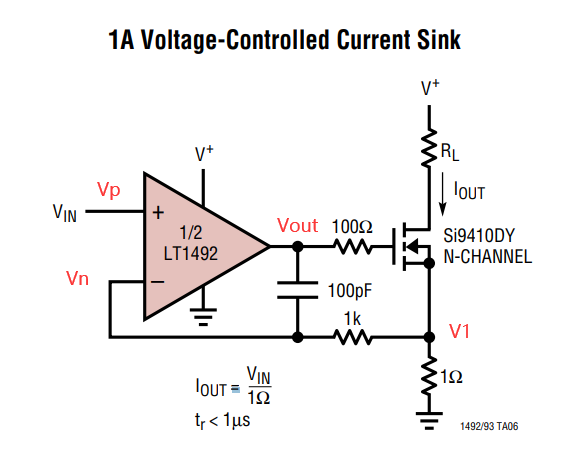 今天,在LT1492的手册里,看到一个运算放大器和MOS管组成的恒流源电路,与各位同好一起分析一下原理以及使用注意事项。