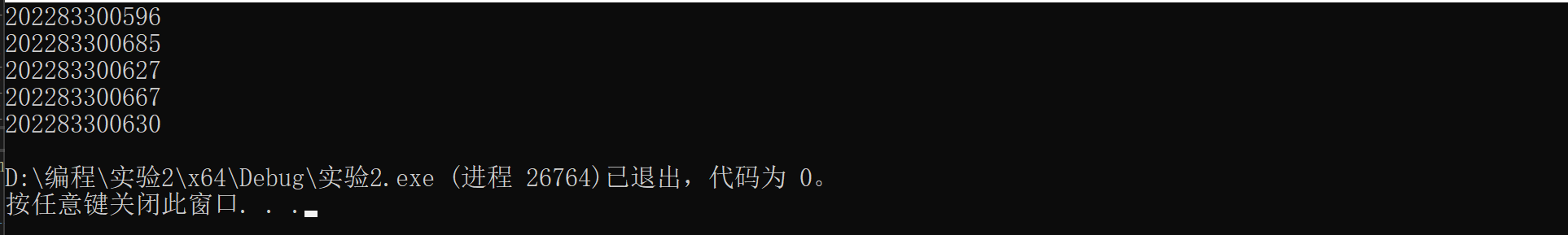 #include <stdio.h> #include <stdlib.h> #include <time.h> #define N 5 #define R1 586 #define R2 701 int main() { int number; int i; srand(time(0)); for (i = 0; i < N; ++i) { number = rand() % (R2 - R1 + 1) + R1; printf("20228330%04d\n", number); } return 0; }