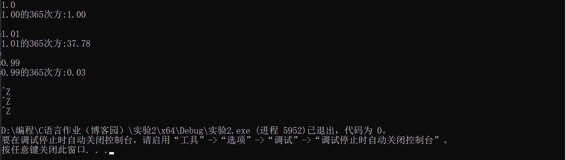 #include <stdio.h> #include <math.h> int main() { double x,ans; while(scanf_s("%lf",&x)!=EOF) { ans = pow(x,365); printf("%.2f的365次方:%.2f\n",x,ans); printf("\n"); } return 0; }