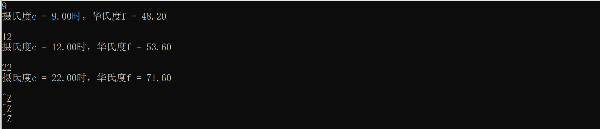 #define _CRT_SECURE_NO_WARNINGS 1 #include <stdio.h> #include <math.h> int main() { double c,f; while (scanf("%lf", &c) != EOF) { f = 9 * c / 5 + 32; printf("摄氏度c = %.2lf时,华氏度f = %.2lf\n", c, f); printf("\n"); } return 0; }
