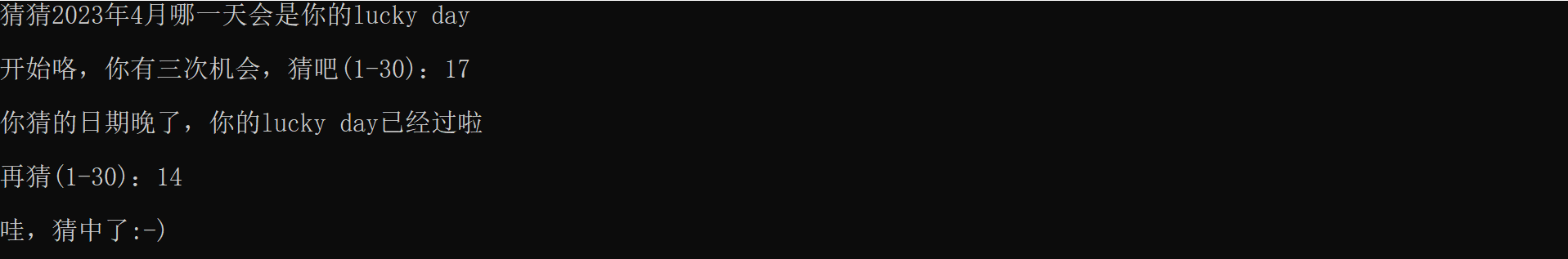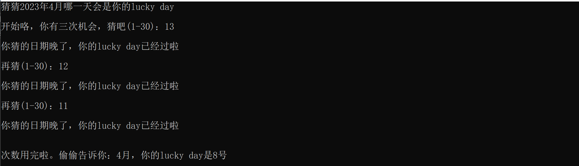 #define _CRT_SECURE_NO_WARNINGS 1 #include <stdio.h> #include <stdlib.h> #include <time.h> int main() { int Luckyday,day,i; srand((unsigned)time(NULL)); Luckyday = rand() % 30 + 1; printf("猜猜2023年4月哪一天会是你的lucky day\n"); printf("\n开始咯,你有三次机会,猜吧(1-30):"); for (i = 3; i > 0; i--) { scanf_s("%d", &day); if (day < Luckyday) { printf("\n你猜的日期早了,你的lucky day还没到呢\n"); if (i > 1) printf("\n再猜(1-30):"); else printf("\n\n"); } if (day > Luckyday) { printf("\n你猜的日期晚了,你的lucky day已经过啦\n"); if (i > 1) printf("\n再猜(1-30):"); else printf("\n\n"); } if (day == Luckyday) { printf("\n哇,猜中了:-)\n"); break; } if (i == 1) { printf("次数用完啦。偷偷告诉你:4月,你的lucky day是%d号\n", Luckyday); break; } } return 0; }