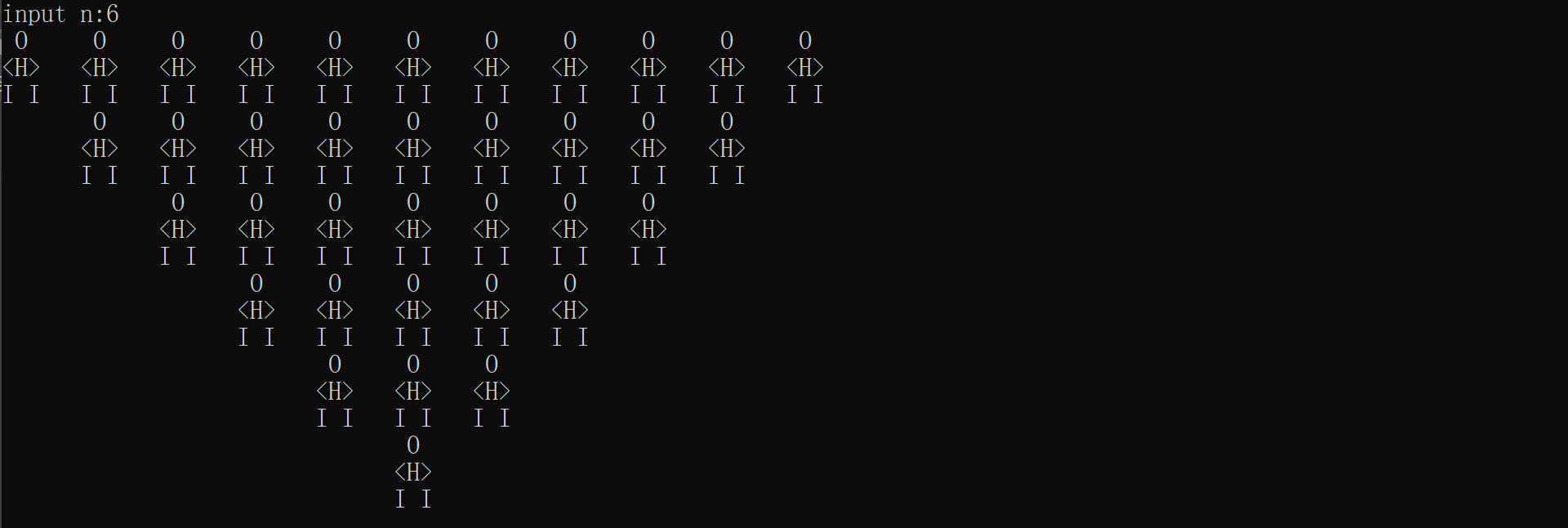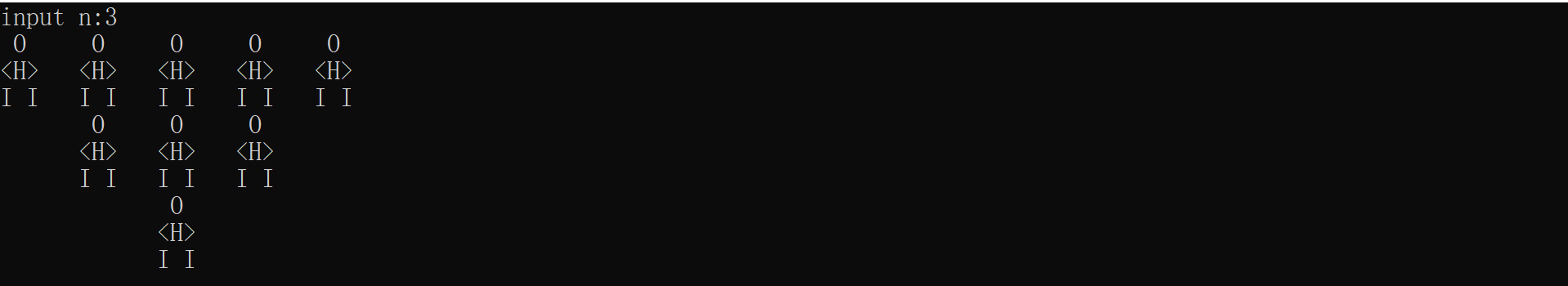 #include<stdio.h> int main() { int n; printf("input n:"); scanf("%d", &n); for (int i = 1;i <= n; i++) { for (int k = 1;k <= 3; k++) { for (int j = 1;j <= i - 1; j++) { printf(" "); } for (int j = 1;j <= 2 * (n - i) + 1; j++) { if (k == 1) printf(" O "); if (k == 2) printf("<H> "); if (k == 3) printf("I I "); } printf("\n"); } } return 0; }