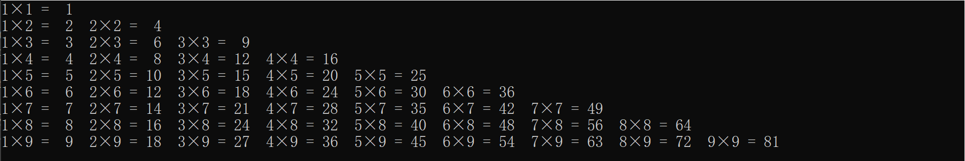#include<stdio.h> int main() { int i, j; for (i = 1; i <= 9; i++) { for (j = 1; j <= i; j++) { printf("%d×%d =%3d ", j, i, j * i); } printf("\n"); } return 0; }