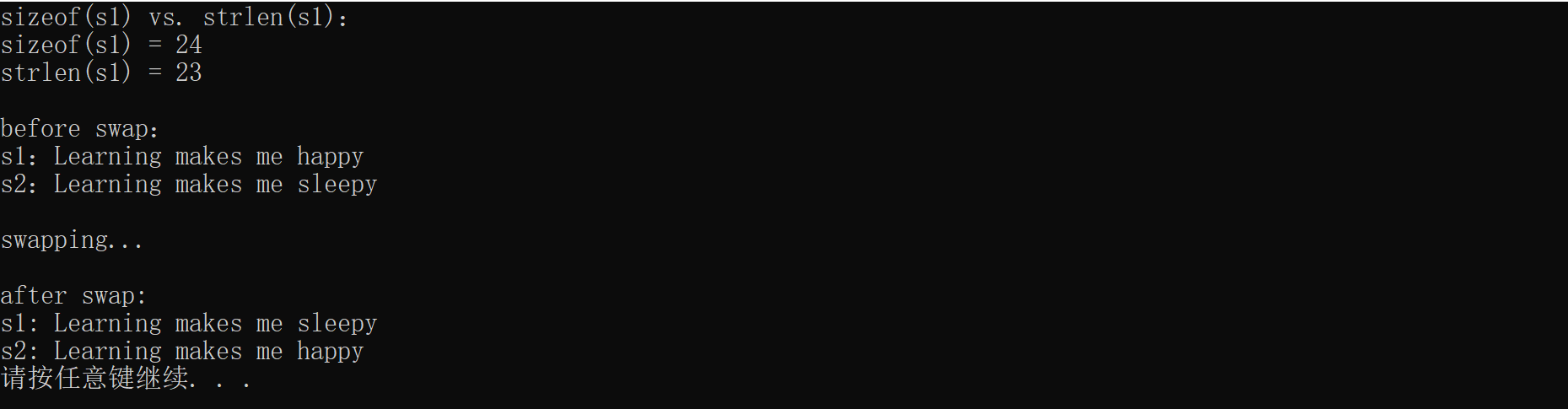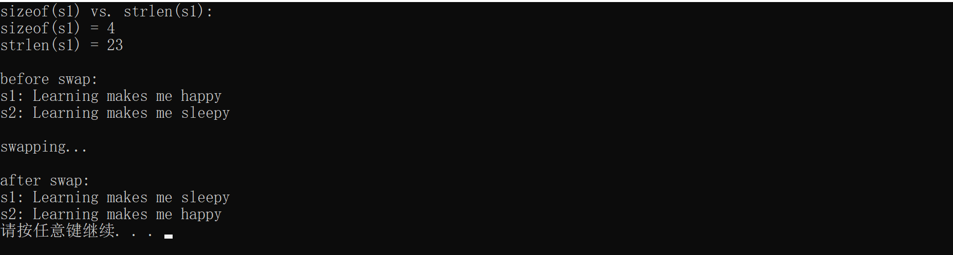 #include <stdio.h> #include <stdlib.h> #include <string.h> #define N 80 int main() { char *s1 = "Learning makes me happy"; char *s2 = "Learning makes me sleepy"; char *tmp; printf("sizeof(s1) vs. strlen(s1): \n"); printf("sizeof(s1) = %d\n", sizeof(s1)); printf("strlen(s1) = %d\n", strlen(s1)); printf("\nbefore swap: \n"); printf("s1: %s\n", s1); printf("s2: %s\n", s2); printf("\nswapping...\n"); tmp = s1; s1 = s2; s2 = tmp; printf("\nafter swap: \n"); printf("s1: %s\n",s1); printf("s2: %s\n",s2); system("pause"); return 0; }