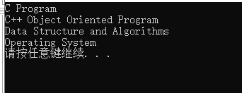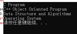 #include <stdio.h> #include <string.h> #include<stdlib.h> void sort(char *name[], int n); int main() { char *course[4] = {"C Program", "C++ Object Oriented Program", "Operating System", "Data Structure and Algorithms"}; int i; sort(course, 4); for (i = 0; i < 4; i++) printf("%s\n", course[i]); system("pause"); return 0; } void sort(char *name[], int n) { int i, j; char *tmp; for (i = 0; i < n - 1; ++i) for (j = 0; j < n - 1 - i; ++j) if (strcmp(name[j], name[j + 1]) > 0) { tmp = name[j]; name[j] = name[j + 1]; name[j + 1] = tmp; } }
