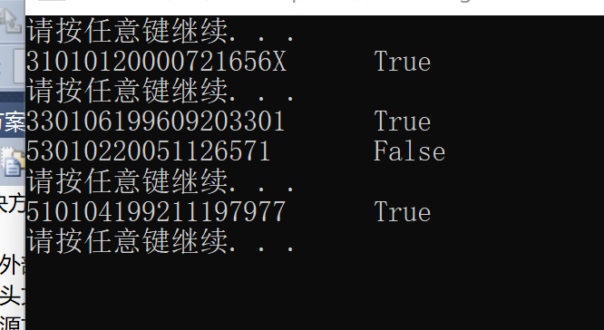 #include <stdio.h> #include <string.h> #define N 5 int check_id(char *str); // 函数声明 int main() { char *pid[N] = {"31010120000721656X", "330106199609203301", "53010220051126571", "510104199211197977", "53010220051126133Y"}; int i; for (i = 0; i < N; ++i) if (check_id(pid[i])) // 函数调用 printf("%s\tTrue\n", pid[i]); else printf("%s\tFalse\n", pid[i]); return 0; } // 函数定义 // 功能: 检查指针str指向的身份证号码串形式上是否合法。 // 形式合法,返回1,否则,返回0 int check_id(char *str) { if(strlen(str)!=18) return 0; else { char *p; p=str; while(*p>='0'&&*p<='9'&&*p!='\0'||*p=='X') p++; if(*p=='\0') return 1; else return 0; } }