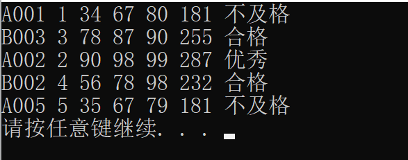 #include <stdio.h> #include <stdlib.h> #include <string.h> #define N 5 typedef struct student { char name[10]; int num; int maths; int computer; int English; int sum; char level[10]; } STU; void fun(STU a[], int n); // 函数声明 int main() { STU s[6*N]={ {"A001", 1, 34, 67, 80}, {"B003", 3, 78, 87, 90}, {"A002", 2, 90, 98, 99}, {"B002", 4, 56, 78, 98}, {"A005", 5, 35, 67, 79} }; int i; fun(s, N); for(i = 0; i < N; i++) printf("%s %d %d %d %d %d %s\n", s[i].name, s[i].num, s[i].maths, s[i].computer, s[i].English, s[i].sum, s[i].level); system("pause"); return 0; } // 函数定义 // 功能:对包含n条学生成绩记录的数组a进行处理: // 计算三门课程总分、总分最大值、总分最小值,并设置等级: // 总分与总分最大值相等的同学的等级设置为优秀 // 总分与总分最小值相等的同学的等级设置为不及格 // 其余同学的等级设置为合格 void fun(STU a[], int n) { // 待补足 // xxx int i,max=0,min=300; for(i=0;i<n;i++){ a[i].sum = a[i].maths + a[i].computer + a[i].English; if(max < a[i].sum) max = a[i].sum; if(min > a[i].sum) min = a[i].sum; } for(i=0;i<n;i++){ if(a[i].sum == max) strcpy(a[i].level,"优秀"); else if(a[i].sum == min) strcpy(a[i].level,"不及格"); else strcpy(a[i].level,"合格"); } }