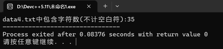 #include<stdio.h> int main() { char s[100]; FILE *fp; int i = 0,j,k = 0; char ch; fp = fopen("data4.txt","rb"); if(fp == NULL) { printf("fail to open file\n"); return 1; } ch = fgetc(fp); while(ch!=EOF) { s[i++] = ch; ch = fgetc(fp); } for(j = 0;j<i-1;j++) if(s[j]!=' ') k++; fclose(fp); printf("data4.txt中共包含字符数(不计空白符):%d",k-1); return 0; }