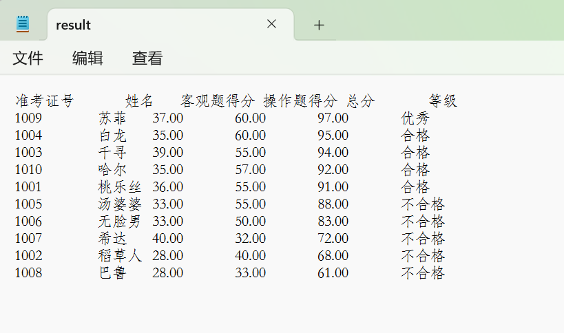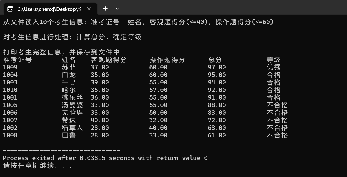 #include <stdio.h> #include <string.h> #include <stdlib.h> #define N 10 typedef struct { long int id; char name[20]; float objective; // 客观题得分 float subjective; // 操作题得分 float sum; char level[10]; } STU; // 函数声明 void input(STU s[], int n); void output(STU s[], int n); void process(STU s[], int n); int main() { STU stu[N]; printf("从文件读入%d个考生信息: 准考证号,姓名,客观题得分(<=40),操作题得分(<=60)\n", N); input(stu, N); printf("\n对考生信息进行处理: 计算总分,确定等级\n"); process(stu, N); printf("\n打印考生完整信息, 并保存到文件中"); output(stu, N); return 0; } // 从文本文件examinee.txt读入考生信息:准考证号,姓名,客观题得分,操作题得分 void input(STU s[], int n) { int i; FILE *fin; fin = fopen("examinee.txt", "r"); if (fin == NULL) { printf("fail to open file\n"); exit(0); } while (!feof(fin)) { for (i = 0; i < n; i++) fscanf(fin, "%ld %s %f %f", &s[i].id, s[i].name, &s[i].objective, &s[i].subjective); } fclose(fin); } // 输出考生完整信息: 准考证号,姓名,客观题得分,操作题得分,总分,等级 // 不仅输出到屏幕上,还写到文本文件result.txt中 void output(STU s[], int n) { FILE *fout; int i; // 输出到屏幕 printf("\n"); printf("准考证号\t姓名\t客观题得分\t操作题得分\t总分\t\t等级\n"); for (i = 0; i < n; i++) printf("%ld\t\t%s\t%.2f\t\t%.2f\t\t%.2f\t\t%s\n", s[i].id, s[i].name, s[i].objective, s[i].subjective, s[i].sum, s[i].level); // 保存到文件 fout = fopen("result.txt", "w"); if (!fout) { printf("fail to open or create result.txt\n"); exit(0); } fprintf(fout, "准考证号\t\t姓名\t客观题得分\t操作题得分\t总分\t\t等级\n"); for (i = 0; i < n; i++) fprintf(fout, "%ld\t\t%s\t%.2f\t\t%.2f\t\t%.2f\t\t%s\n", s[i].id, s[i].name, s[i].objective, s[i].subjective, s[i].sum, s[i].level); fclose(fout); } // 对考生信息进行处理:计算总分,排序,确定等级 void process(STU s[], int n) { int i,j; STU temp; for (i=0;i<n;i++) { s[i].sum=s[i].objective+s[i].subjective; } for(i=0;i<n-1;i++) for (j=0;j<n-1;j++){ if (s[j].sum<s[j+1].sum) { temp=s[j]; s[j]=s[j+1]; s[j+1]=temp; } } for (i=0;i<n;i++) { if (i+1<=n*0.1) strcpy(s[i].level,"优秀"); else if (i+1>0.1*n&&i+1<=0.5*n) strcpy (s[i].level,"合格") ; else strcpy (s[i].level,"不合格"); } }