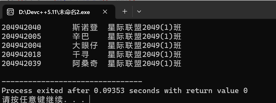 #include<stdio.h> #include<stdlib.h> #include<time.h> #define N 80 int main() { typedef struct { long int id; char name[20]; char class[40]; } STU; STU s[N]; FILE *fin; int i,n; fin = fopen("list.txt","r"); if(fin == NULL) { printf("fail to open\n"); exit(0); } while (!feof(fin)) { for(i = 0;i < N;i++) fscanf(fin, "%ld %s %s", &s[i].id, s[i].name, s[i].class); } srand(time(NULL)); int x[5]; for(i = 0;i < 5;i++) x[i] = rand()% 80 + 1; for(i =0;i < 5;i++) { printf("%ld\t%s\t%s\n",s[x[i]].id,s[x[i]].name,s[x[i]].class); } FILE *fout; fout = fopen("lucky.txt", "w"); if (!fout) { printf("fail to open or create result.txt\n"); exit(0); } for (i = 0; i < 5; i++) fprintf(fout,"%ld\t%s\t%s\n",s[x[i]].id,s[x[i]].name,s[x[i]].class); fclose(fout); return 0; }