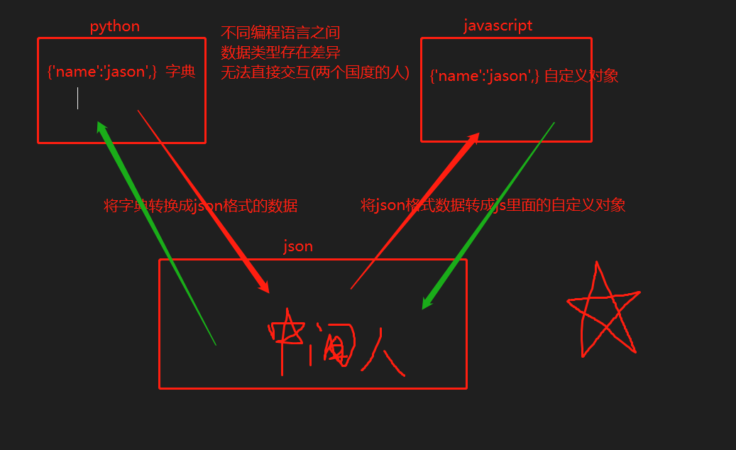 所以必须需要通过 json 在中间转换一下(就相当于外国人(A)和中国人(B)在一起交流不畅通 需要翻译才能交流 这个 json模块 就是充当翻译的角色