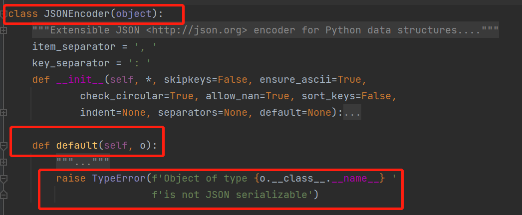 # 查看JSONEncoder源码发现序列化报错是有default方法触发的