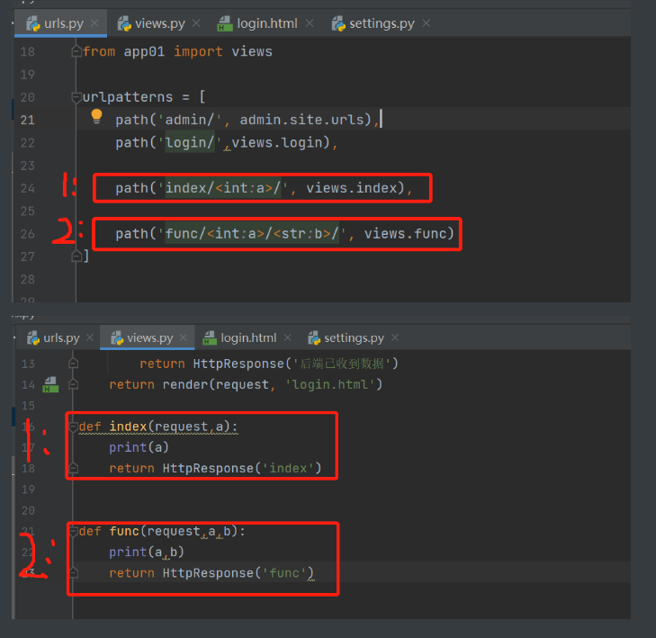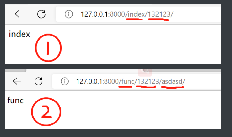 re_path('^test/(?P<year>\d+)/(?P<others>.*?)/', views.test) # 正则表达式匹配到的内容会当做视图函数的关键字参数传递给视图函数 # 写 views 中 代码: def test(request,year,others): print(a,b) return HttpResponse('test') -