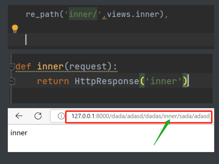 - re_path('^test/$', views.test)(这样确定好开头和结尾就必须是inner才可以访问了)