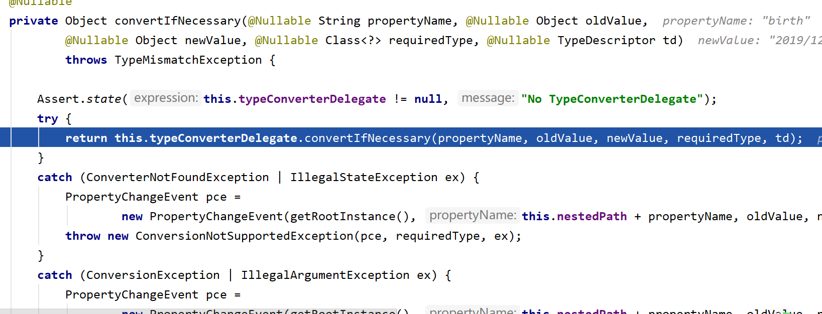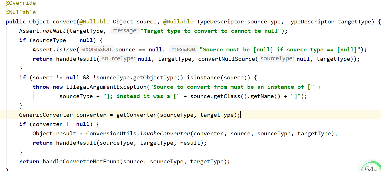然后一直放行到convert方法中,上一步已经通过getConverter得到了转换器