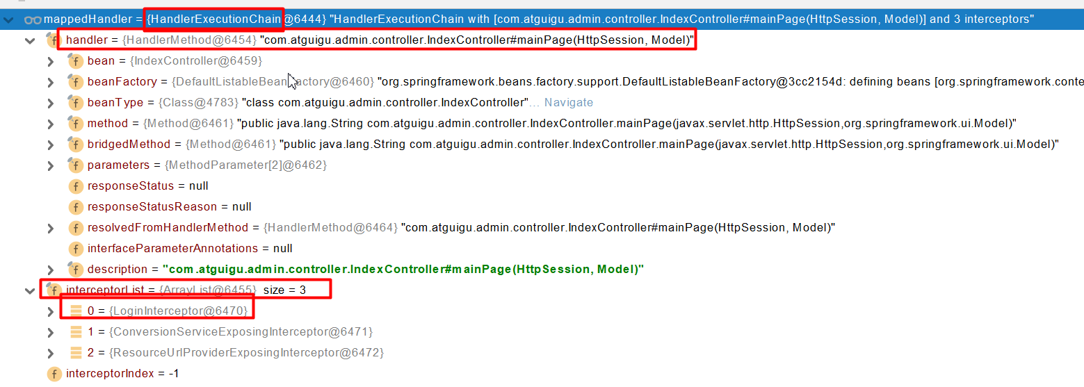 // 拿到请求处理器,里面有拦截器的数组HandlerInterceptor[]