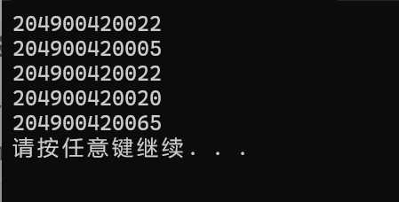 1 #include <stdio.h> 2 #include <stdlib.h> 3 #include <time.h> 4 5 #define N 5 6 7 int main() { 8 int number; 9 int i; 10 11 srand(time(0)); 12 for(i = 0; i < N; ++i) { 13 number = rand() % 100 + 1; 14 printf("20490042%04d\n", number); 15 } 16 17 return 0; 18 }