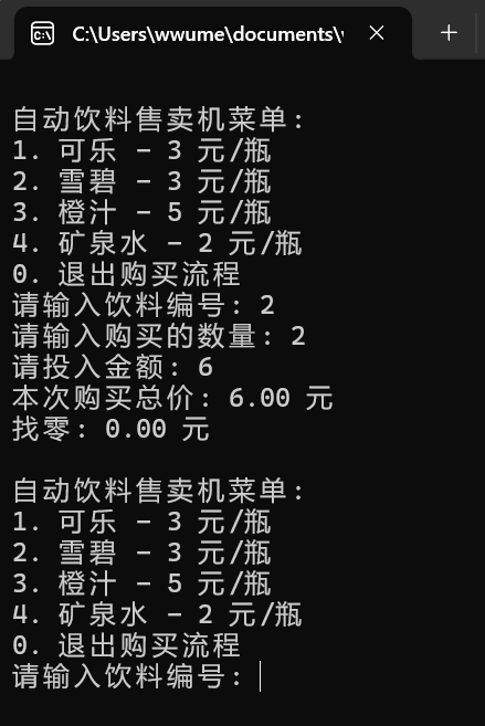 #include <stdio.h> int main() { int choice, quantity; float total_price = 0, amount_paid, change; while (1) { printf("\n自动饮料售卖机菜单:\n"); printf("1. 可乐 - 3 元/瓶\n"); printf("2. 雪碧 - 3 元/瓶\n"); printf("3. 橙汁 - 5 元/瓶\n"); printf("4. 矿泉水 - 2 元/瓶\n"); printf("0. 退出购买流程\n"); printf("请输入饮料编号: "); scanf("%d", &choice); if (choice == 0) break; if (choice < 1 || choice > 4) { printf("无效的饮料编号,请重新输入。\n"); continue; } printf("请输入购买的数量: "); scanf("%d", &quantity); if (quantity < 0) { printf("购买数量不能为负数,请重新输入。\n"); continue; } switch (choice) { case 1: case 2: total_price += 3 * quantity; break; case 3: total_price += 5 * quantity; break; case 4: total_price += 2 * quantity; break; } printf("请投入金额: "); scanf("%f", &amount_paid); change = amount_paid - total_price; printf("本次购买总价: %.2f 元\n", total_price); printf("找零: %.2f 元\n", change); total_price = 0; }//对价格进行一个初始化,下一个人来买的时候计价从零开始,如果去掉,下一个人买的时候会从上一个人的总价开始计价,会一直累加 printf("感谢您的购买,欢迎下次光临!\n"); return 0; }