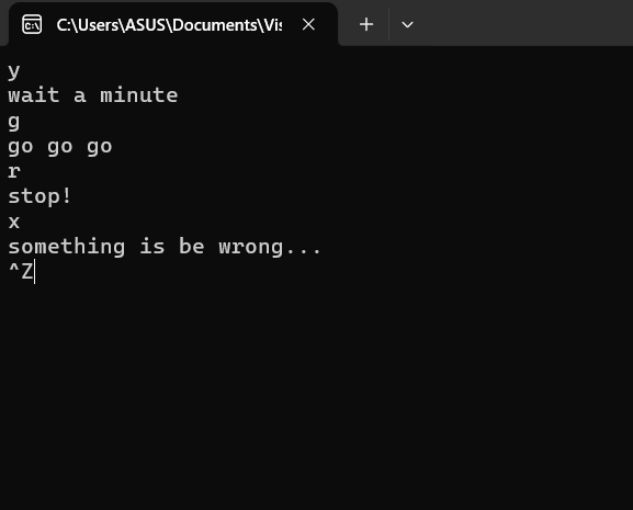 #include <stdio.h> #include <stdlib.h> int main() { char color; while((color=getchar()) !=EOF){ getchar(); switch(color){ case 'r':printf("stop!\n");break; case 'g':printf("go go go\n");break; case 'y':printf("wait a minute\n");break; default: printf("something is be wrong...\n");break; } } system("pause"); return 0; }