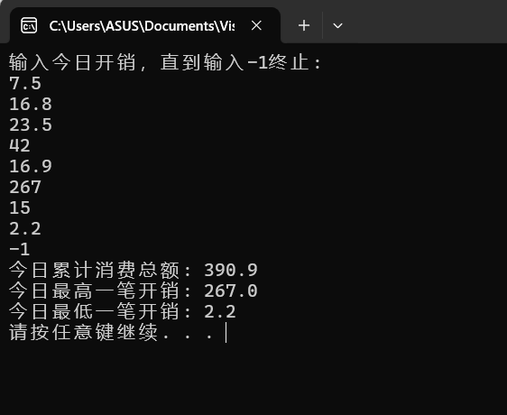 #include <stdio.h> #include <stdlib.h> int main() { double x,sum,max,min; printf("输入今日开销,直到输入-1终止:\n"); scanf("%lf",&x); max=x; min=x; sum=0; while (x!=-1) { sum+=x; if (x>max) max=x; if (x<min) min=x; scanf("%lf",&x); } printf("今日累计消费总额: %.1f\n",sum); printf("今日最高一笔开销: %.1f\n",max); printf("今日最低一笔开销: %.1f\n",min); system("pause"); return 0; }