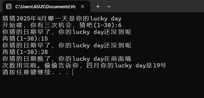 #include <stdio.h> #include <stdlib.h> #include <time.h> int main() { int num,lucky,i,flag; srand(time(NULL)); lucky=rand()%30+1; flag=0; printf("猜猜2025年4月哪一天是你的lucky day\n"); printf("开始喽,你有三次机会,猜吧(1-30):"); for (i=0;i<3;i++) { scanf("%d",&num); if (num>lucky) printf("你猜的日期晚了,你的lucky day在前面哦\n"); if (num<lucky) printf("你猜的日期早了,你的lucky day还没到呢\n"); if (i<2) printf("再猜(1-30):"); continue; if (num=lucky) printf("哇,猜对了"); flag=1; break; } if (flag==0) printf("次数用完啦。偷偷告诉你,四月你的lucky day是%d号\n",lucky); system("pause"); return 0; }