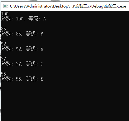 1 #include<stdlib.h> 2 3 char score_to_grade(int score); // 函数声明 4 5 int main() { 6 int score; 7 char grade; 8 9 while(scanf("%d", &score) != EOF) { 10 grade = score_to_grade(score); // 函数调用 11 printf("分数: %d, 等级: %c\n\n", score, grade); 12 } 13 14 return 0; 15 } 16 17 // 函数定义 18 char score_to_grade(int score) { 19 char ans; 20 21 switch(score/10) { 22 case 10: 23 case 9: ans = 'A'; break; 24 case 8: ans = 'B'; break; 25 case 7: ans = 'C'; break; 26 case 6: ans = 'D'; break; 27 default: ans = 'E'; 28 } 29 30 return ans; 31 }
