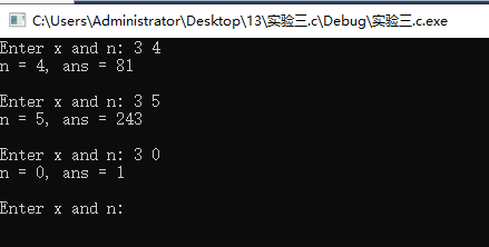 1 #include <stdio.h> 2 3 int power(int x, int n); // 函数声明 4 5 int main() { 6 int x, n; 7 int ans; 8 9 while(printf("Enter x and n: "), scanf("%d%d", &x, &n) != EOF) { 10 ans = power(x, n); // 函数调用 11 printf("n = %d, ans = %d\n\n", n, ans); 12 } 13 14 return 0; 15 } 16 17 // 函数定义 18 int power(int x, int n) { 19 int t; 20 21 if(n == 0) 22 return 1; 23 else if(n % 2) 24 return x * power(x, n-1); 25 else { 26 t = power(x, n/2); 27 return t*t; 28 } 29 }