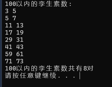 1 #include <stdio.h> 2 #include <stdlib.h> 3 int is_prime(int n); 4 5 int main(){ 6 int i,c=0; 7 printf("100以内的孪生素数:\n"); 8 for(i=1;i<=100;++i){ 9 if (is_prime(i)){ 10 if (is_prime(i+2)){ 11 printf("%d %d\n",i,i+2); 12 c+=1; 13 } 14 } 15 } 16 printf("100以内的孪生素数共有%d个\n",c); 17 system("pause"); 18 return 0; 19 } 20 21 int is_prime(int n){ 22 int i,f=1; 23 if (n==1) 24 f=0; 25 for(i=2;i<=n/2;++i){ 26 if (n%i==0){ 27 f=0; 28 break; 29 } 30 } 31 return f; 32 }