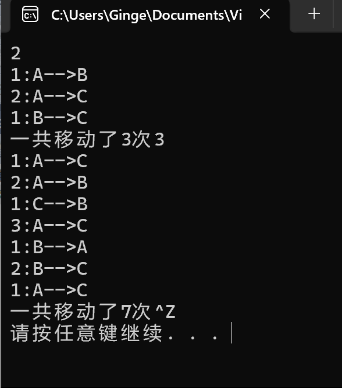 1 #include<stdio.h> 2 int s=0; 3 void hanoi(unsigned int n,char from,char temp,char to); 4 void moveplate(unsigned int n,char from,char to); 5 int main(){ 6 7 unsigned int n; 8 while(scanf("%u",&n)!=EOF){ 9 s=0; 10 hanoi(n,'A','B','C'); 11 printf("\n"); 12 printf("一共移动了%d次\n",s); 13 } 14 15 return 0; 16 } 17 void hanoi(unsigned int n,char from,char temp,char to){ 18 19 if(n==1) 20 moveplate(n,from,to); 21 else{ 22 hanoi(n-1,from,to,temp); 23 moveplate(n,from,to); 24 hanoi(n-1,temp,from,to); 25 } 26 } 27 void moveplate(unsigned int n,char from,char to){ 28 29 printf("%u:%c-->%c\n",n,from,to); 30 s++; 31 32 }