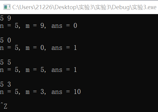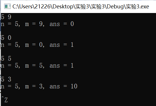 1 #include <stdio.h> 2 #include <stdlib.h> 3 int func(int n, int m); // 函数声明 4 5 int main() { 6 int n, m; 7 int ans; 8 9 while(scanf("%d%d", &n, &m) != EOF) { 10 ans = func(n, m); // 函数调用 11 printf("n = %d, m = %d, ans = %d\n\n", n, m, ans); 12 } 13 system("pause"); 14 return 0; 15 } 16 int func(int n, int m) 17 { 18 if(n==m) 19 return 1; 20 if(n<m) 21 return 0; 22 if(m==0) 23 return 1; 24 return func(n-1,m)+func(n-1,m-1); 25 }