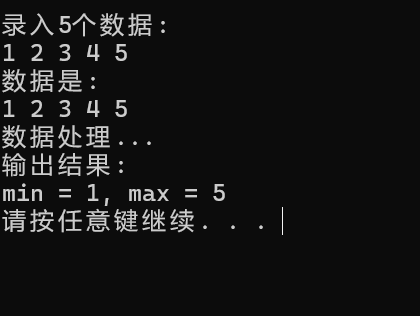 1 #include <stdio.h> 2 #define N 5 3 4 void input(int x[], int n); 5 void output(int x[], int n); 6 void find_min_max(int x[], int n, int *pmin, int *pmax); 7 8 int main() { 9 int a[N]; 10 int min, max; 11 12 printf("录入%d个数据:\n", N); 13 input(a, N); 14 15 printf("数据是: \n"); 16 output(a, N); 17 18 printf("数据处理...\n"); 19 find_min_max(a, N, &min, &max); 20 21 printf("输出结果:\n"); 22 printf("min = %d, max = %d\n", min, max); 23 24 return 0; 25 } 26 27 void input(int x[], int n) { 28 int i; 29 30 for(i = 0; i < n; ++i) 31 scanf("%d", &x[i]); 32 } 33 34 void output(int x[], int n) { 35 int i; 36 37 for(i = 0; i < n; ++i) 38 printf("%d ", x[i]); 39 printf("\n"); 40 } 41 42 void find_min_max(int x[], int n, int *pmin, int *pmax) { 43 int i; 44 45 *pmin = *pmax = x[0]; 46 47 for(i = 0; i < n; ++i) 48 if(x[i] < *pmin) 49 *pmin = x[i]; 50 else if(x[i] > *pmax) 51 *pmax = x[i]; 52 }