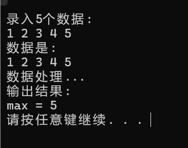 1 #include <stdio.h> 2 #define N 5 3 4 void input(int x[], int n); 5 void output(int x[], int n); 6 int *find_max(int x[], int n); 7 8 int main() { 9 int a[N]; 10 int *pmax; 11 12 printf("录入%d个数据:\n", N); 13 input(a, N); 14 15 printf("数据是: \n"); 16 output(a, N); 17 18 printf("数据处理...\n"); 19 pmax = find_max(a, N); 20 21 printf("输出结果:\n"); 22 printf("max = %d\n", *pmax); 23 24 return 0; 25 } 26 27 void input(int x[], int n) { 28 int i; 29 30 for(i = 0; i < n; ++i) 31 scanf("%d", &x[i]); 32 } 33 34 void output(int x[], int n) { 35 int i; 36 37 for(i = 0; i < n; ++i) 38 printf("%d ", x[i]); 39 printf("\n"); 40 } 41 42 int *find_max(int x[], int n) { 43 int max_index = 0; 44 int i; 45 46 for(i = 0; i < n; ++i) 47 if(x[i] > x[max_index]) 48 max_index = i; 49 50 return &x[max_index]; 51 }