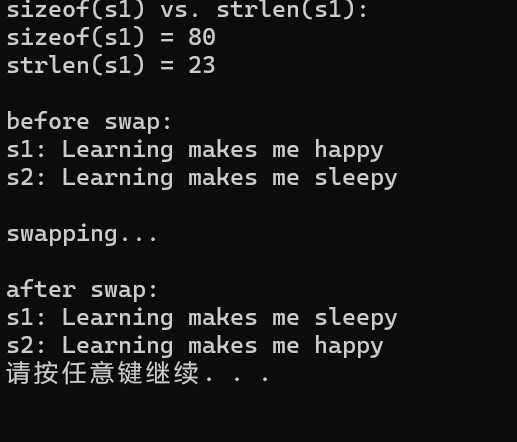 1 #include <stdio.h> 2 #include <string.h> 3 #define N 80 4 5 int main() { 6 char s1[N] = "Learning makes me happy"; 7 char s2[N] = "Learning makes me sleepy"; 8 char tmp[N]; 9 10 printf("sizeof(s1) vs. strlen(s1): \n"); 11 printf("sizeof(s1) = %d\n", sizeof(s1)); 12 printf("strlen(s1) = %d\n", strlen(s1)); 13 14 printf("\nbefore swap: \n"); 15 printf("s1: %s\n", s1); 16 printf("s2: %s\n", s2); 17 18 printf("\nswapping...\n"); 19 strcpy(tmp, s1); 20 strcpy(s1, s2); 21 strcpy(s2, tmp); 22 23 printf("\nafter swap: \n"); 24 printf("s1: %s\n", s1); 25 printf("s2: %s\n", s2); 26 27 return 0; 28 }
